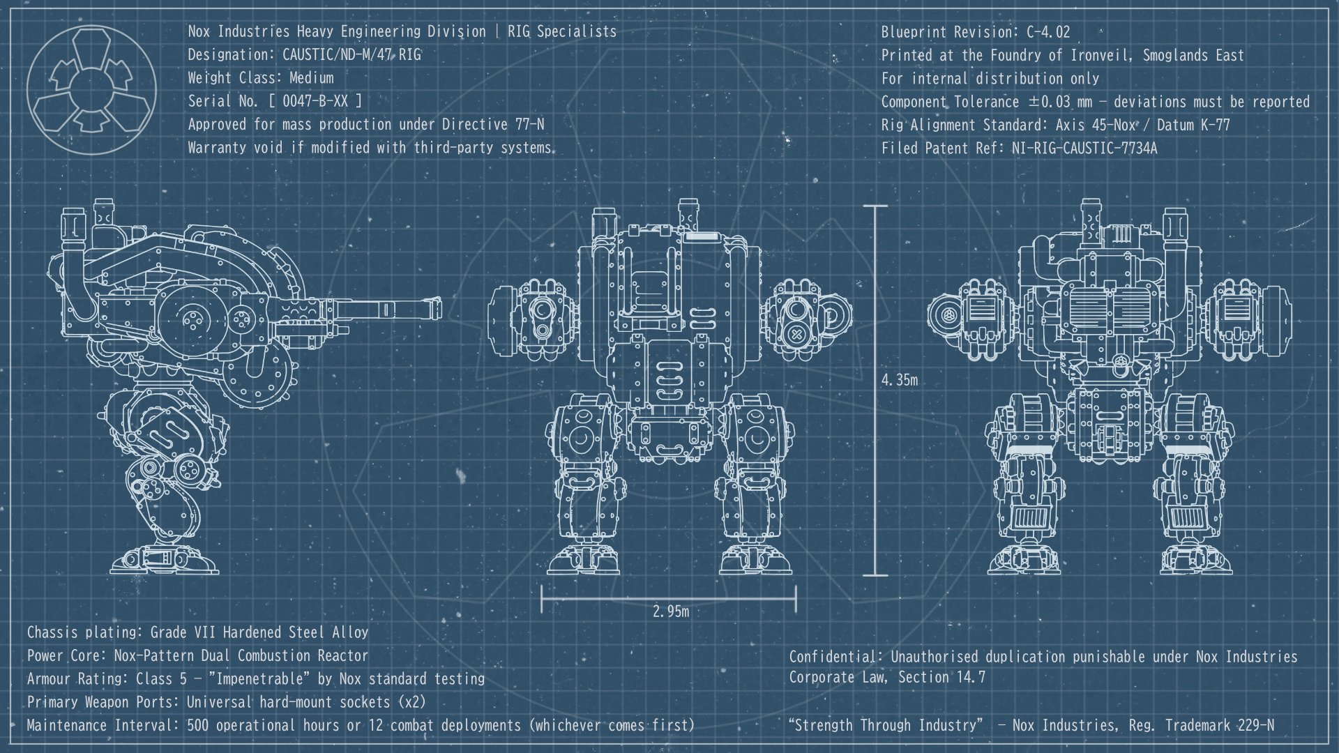 A Rig is a walking war machine, powered by brutal combustion engines and clad in armor plate thick enough to shrug off conventional fire. From nimble light frames darting through shattered streets, to colossal class Rigs that grind cities beneath their feet, every Rig is a modular chassis — built to accept an arsenal of weapons, engines, and equipment tailored to its Ironclad’s need.